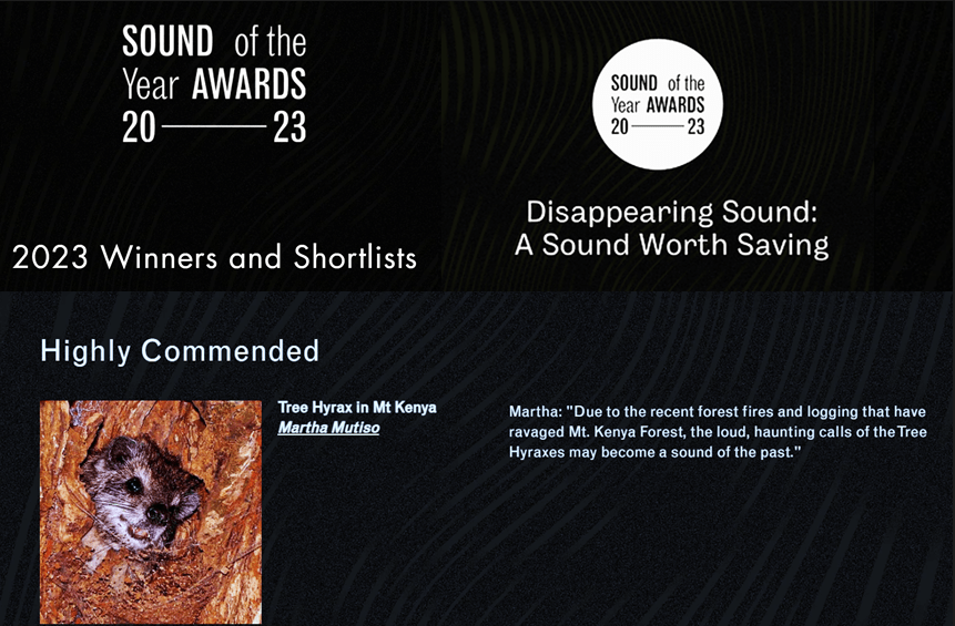 Happy to celebrate this year’s Endangered Species Day by sharing the exciting and timely win of my Sound of the Year Awards Highly Commended submission in the Disappearing Sound-Sound worth saving Category (Tree Hyrax Call in Mt. Kenya).